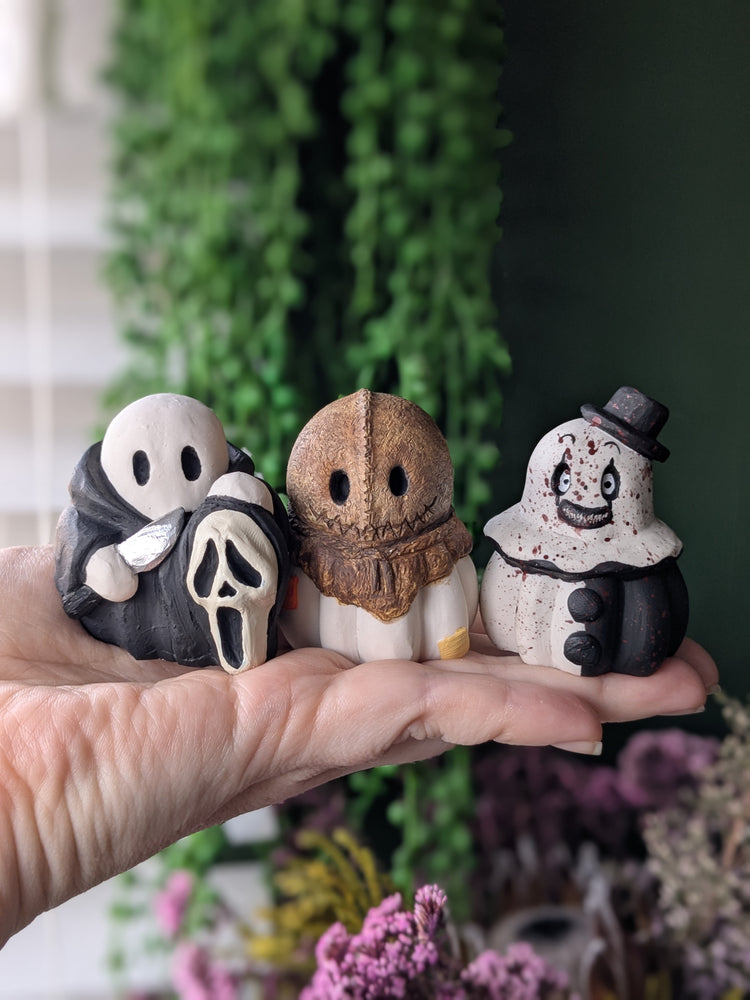 Our Halloween and horror themed ghosties are ready to make mischief! From creepy cute classics like Dracula and plague doctors, to scream-worthy spooks with a knife and a mask! Each one is handmade in our little studio, meaning no two are ever quite the same.