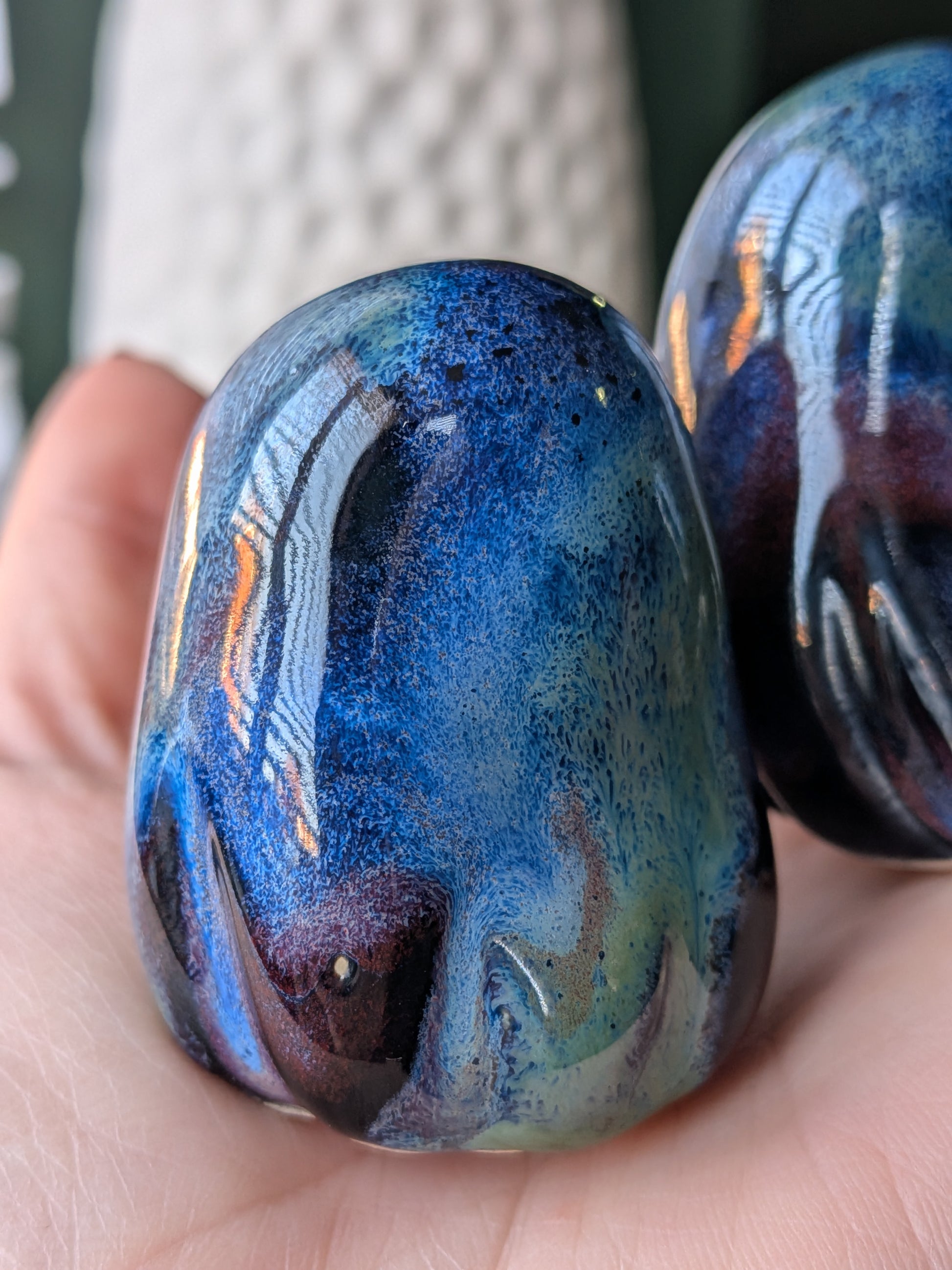 A little spirit shaped from deep waters, drifting skies and the hush of the shoreline at night. Each ghost is hand-sculpted in my Norwich studio and finished with a flowing glaze of inky blues, sea-green ripples and rich burgundy tides. The colours pool and swirl like moonlit waves, creating mesmerising patterns that are completely unique to each piece.