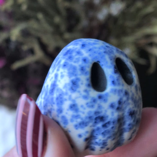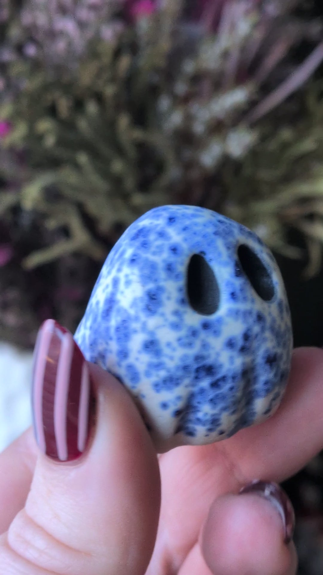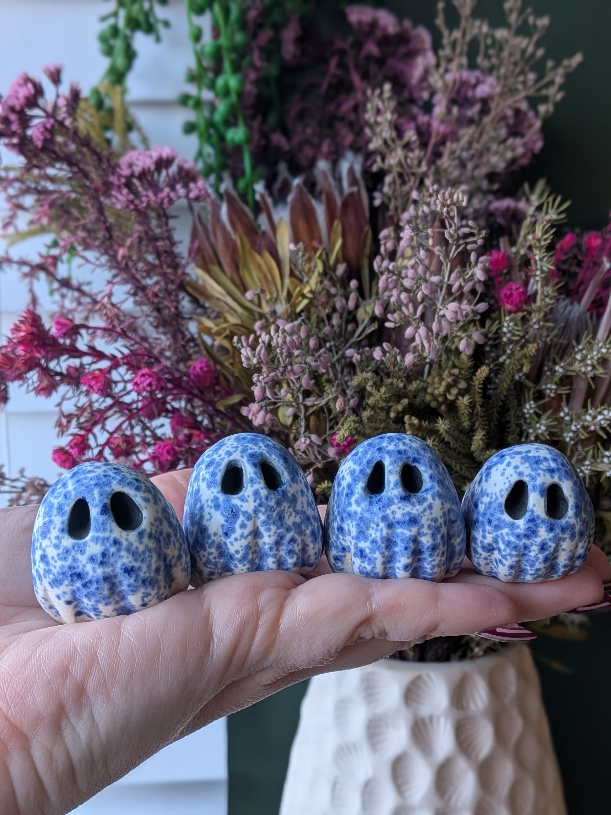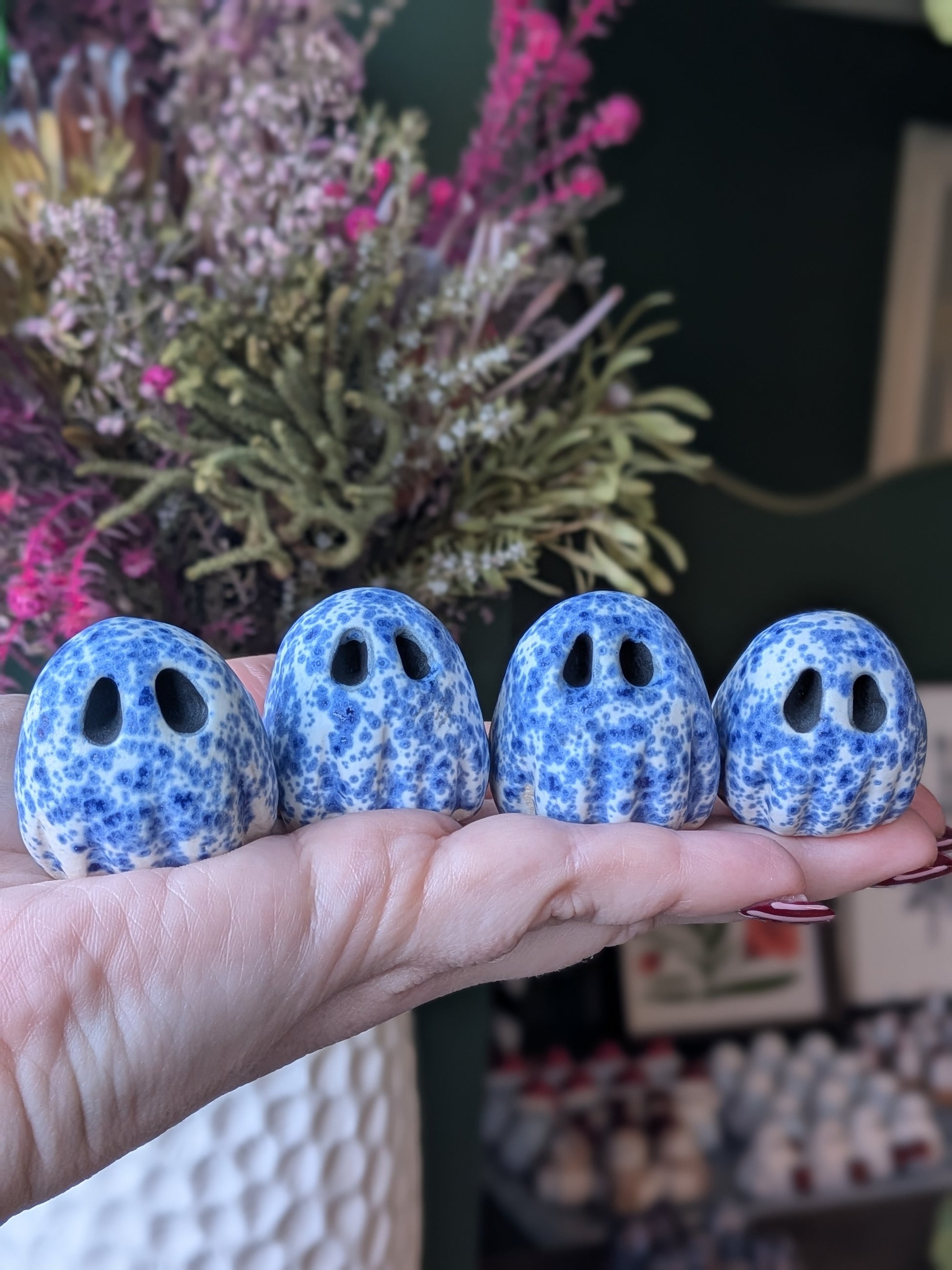 Tiny spirits inspired by traditional blue-and-white ceramics and the soft speckling of hand-painted pottery. Each one is sculpted by hand in my Norwich studio and finished in a delicate glaze of cloud-white and inky cobalt flecks, giving them the look of miniature porcelain curios.