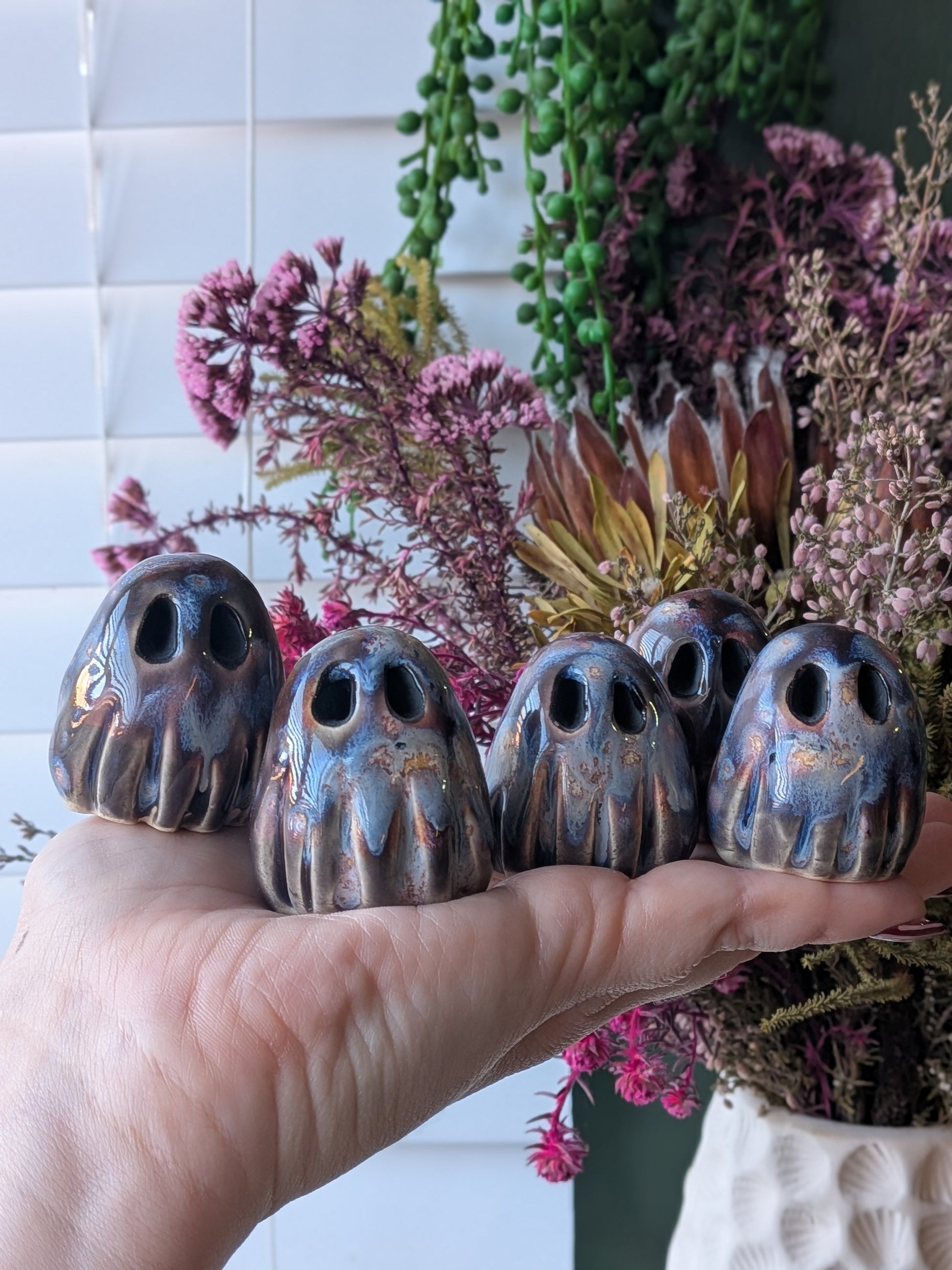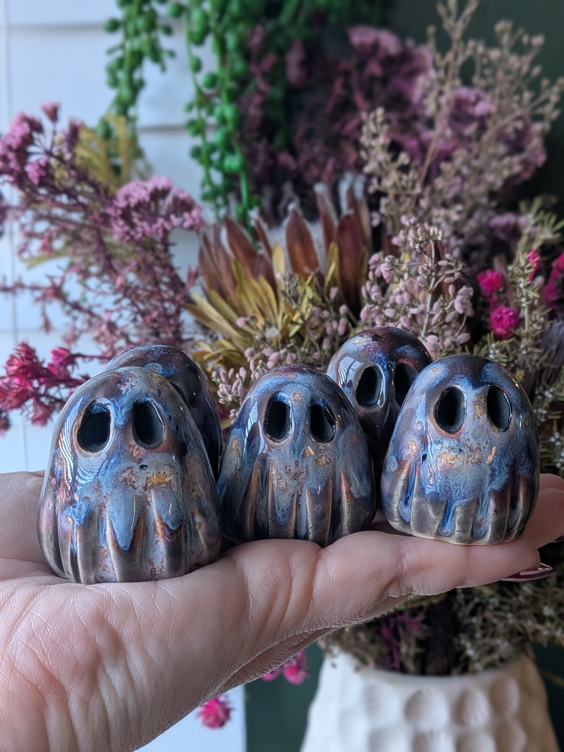 Meet the Starforge Ghost, a little spirit shaped where stardust meets molten metal. Each one is hand-sculpted in my Norwich studio and glazed in a shimmering blend of cosmic blues, ember-bronze, smoky greys and soft light flashes, just like something freshly forged in a celestial blacksmith’s workshop.